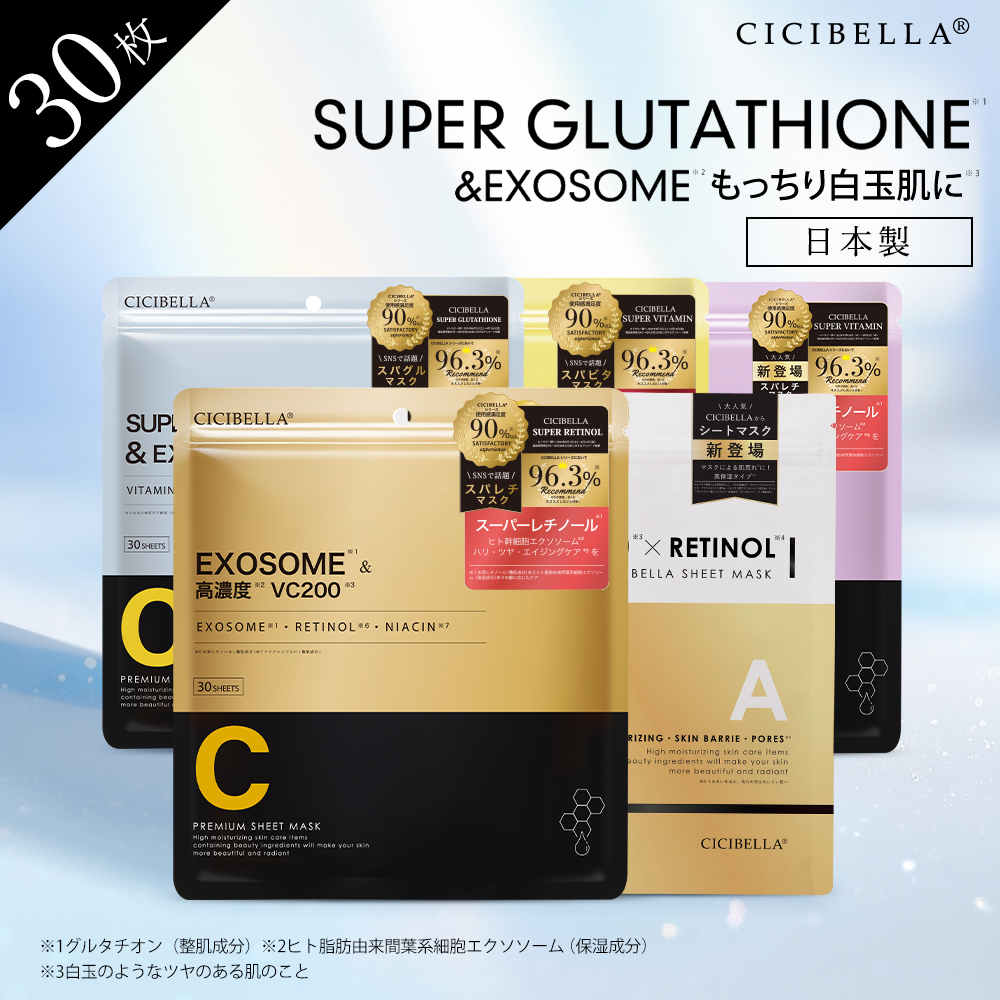 【シシベラスパビタマスク30G SUPERグルタチオン×EXOSOME】水、BG、グリセリン、グルタチオン、ヒト脂肪由来間葉系細胞エクソソーム、ヒト幹細胞順化培養液、アスコルビルメチルカルボニルペンタぺプチド-72-トリ-t-ブチルトリプトファナミド、 パルミチン酸アスコルビル、アルブチン、グリチルリチン酸2K、ヒアルロン酸Na、加水分解コラーゲン、ラベンダー油、レモングラス油、セイヨウハッカ油、ローズマリー葉油、ニオイテンジクアオイ油、 PEG-6O水添ヒマシ油、キサンタンガム、クエン酸、クエン酸Na、メチルパラベン、フェノキシエタノール、リノール酸、リノレン酸、レシチン、水添レシチン、1,2-ヘキサンジオール、ポリソルベート8O、 カプリリルグリコール、酢酸トコフェロール、トリ(カプリル酸/カプリン酸)グリセリル