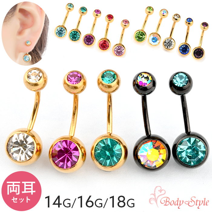 ボディピアス カーブドバーベル 14G 16G 18G ゴールド バナナバーベル へそピアス ヘソピ 耳たぶ ロブ ダブルジュエル クリア オーロラ ライトピンク ピンク レッド グリーン エメラルド ブルー ライトブルー パープル ボディスタイル ジュエル ゴールド シンプル おしゃれ body