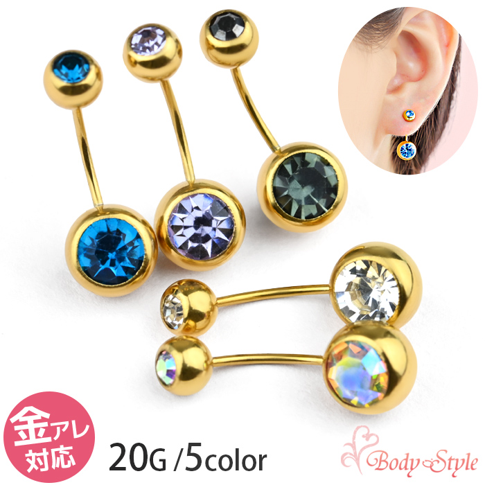 シンプルなゴールドをベースカラーに、キラキラ輝くジュエルが映える大人気の定番バナナバーベルピアスです。へそ・耳の両方に着けられます♪ 細いゲージサイズなので、ボディピ初心者さんやホールが細くなってしまった方にもオススメ! 素材はシャフト・モチーフのすべてに高品質で金属アレルギーを起こしにくい316Lサージカルステンレスを使用。金アレさんにも安心してお使いいただけます。