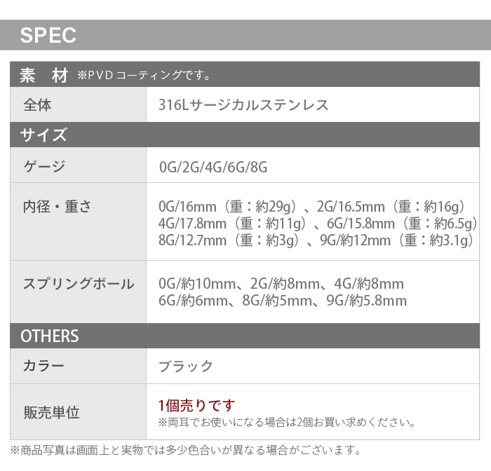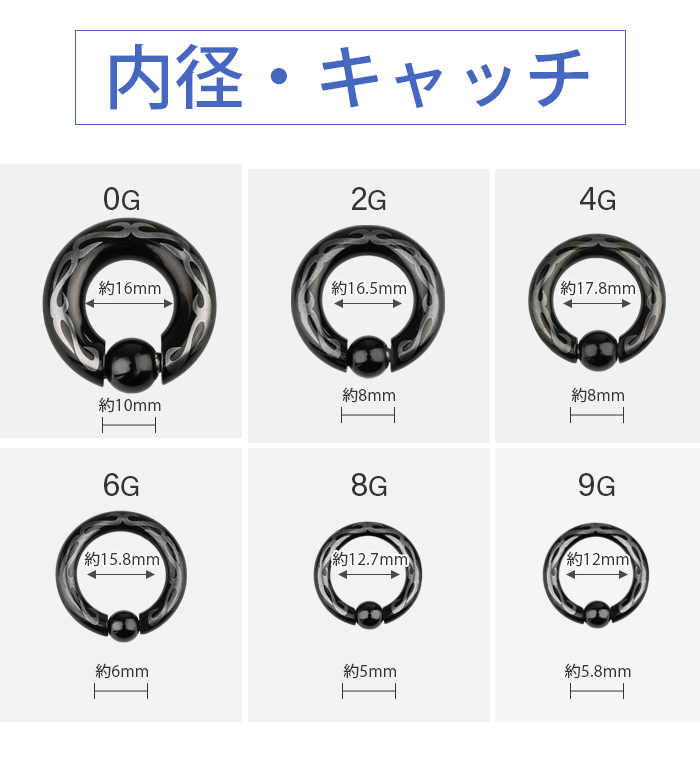 内径・重さ:0G/16mm(重:約29g)、2G/16.5mm(重:約16g)、4G/17.8mm(重:約11g)、6G/15.8mm(重:約6.5g)、8G/12.7mm(重:約3g)、9G/約12mm(重:約3.1g)