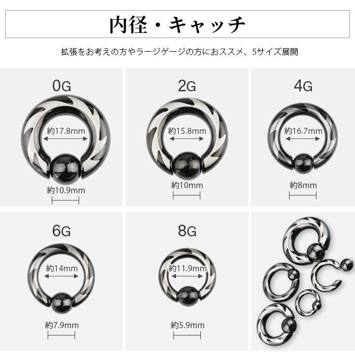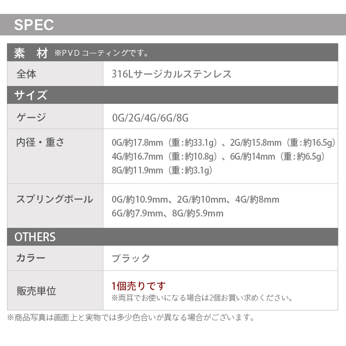 内径・重さ:0G/約17.8mm(重:約33.1g)、2G/約15.8mm(重:約16.5g)、4G/約16.7mm(重:約10.8g)、6G/約14mm(重:約6.5g)、8G/約11.9mm(重:約3.1g)