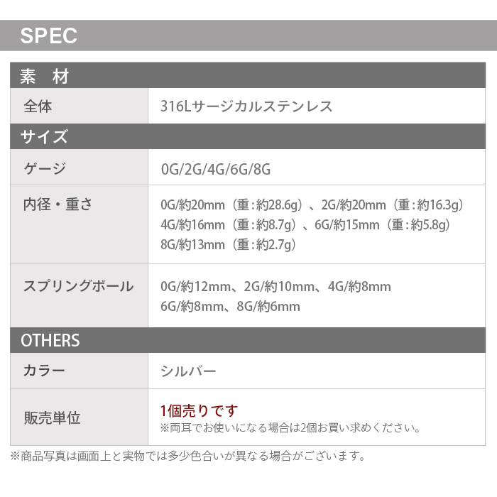 内径・重さ:0G/約20mm(重:約28.6g)、2G/約20mm(重:約16.3g)、4G/約16mm(重:約8.7g)、6G/約15mm(重:約5.8g)、8G/約15mm(重:約2.7g)