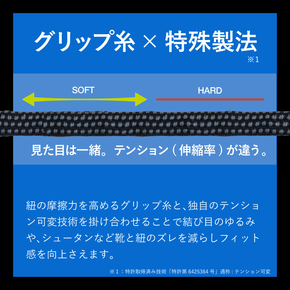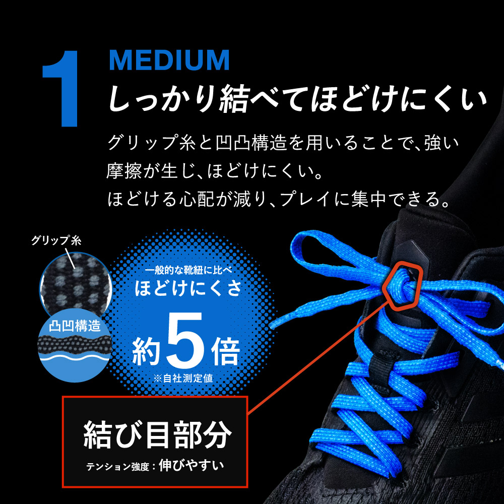 MAGICLACEは紐の伸縮率を部位に合わせて変えることにより、これらの問題を軽減し、足の本来の力を引き出します。
