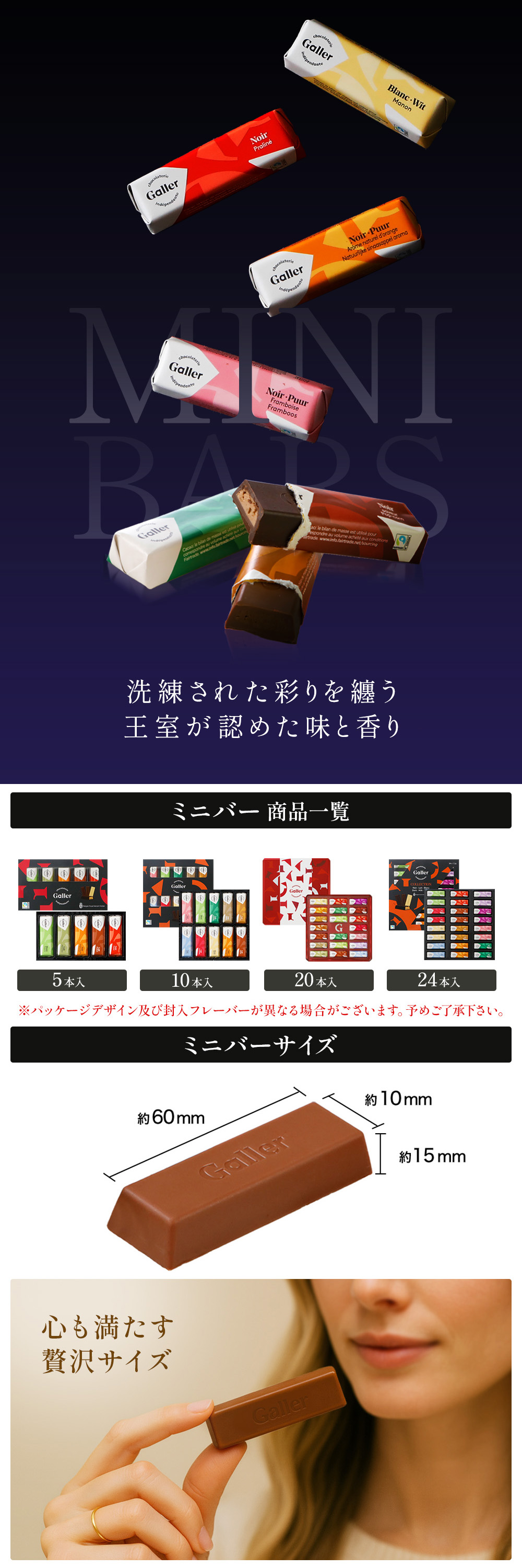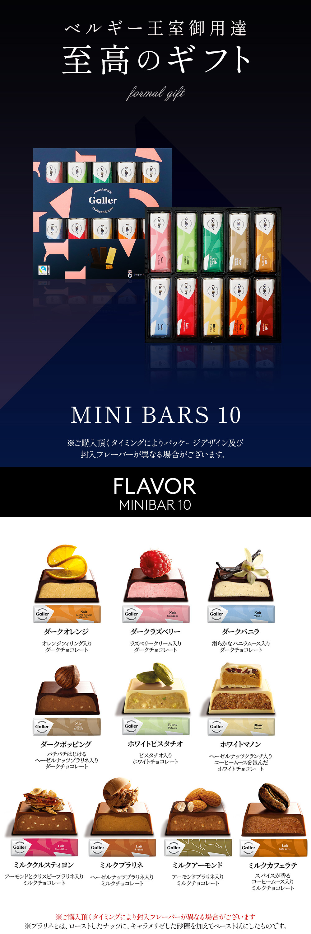 | ■10本入 【ミルク・プラリネ】 ヘーゼルナッツプラリネ入りミルクチョコレート 【ミルク・アーモンド】 アーモンドプラリネ入りミルクチョコレート 【ミルク・クルスティヨン】 アーモンドとクリスピープラリネ入りミルクチョコレート 【ミルク・カフェラテ】 スパイスが香るコーヒームース入りミルクチョコレート 【ダーク・ポッピング】 パチパチはじけるヘーゼルナッツプラリネ入りダークチョコレート 【ダーク・バニラ】 滑らかなバニラムース入りダークチョコレート 【ダーク・ラズベリー】 ラズベリークリーム入りダークチョコレート 【ダーク・オレンジ】 オレンジフィリング入りのダークチョコレート 【ホワイト・マノン】 ヘーゼルナッツクランチ入りコーヒームースを包んだホワイトチョコレート 【ホワイト・ピスタチオ】 ピスタチオ入りホワイトチョコレート |