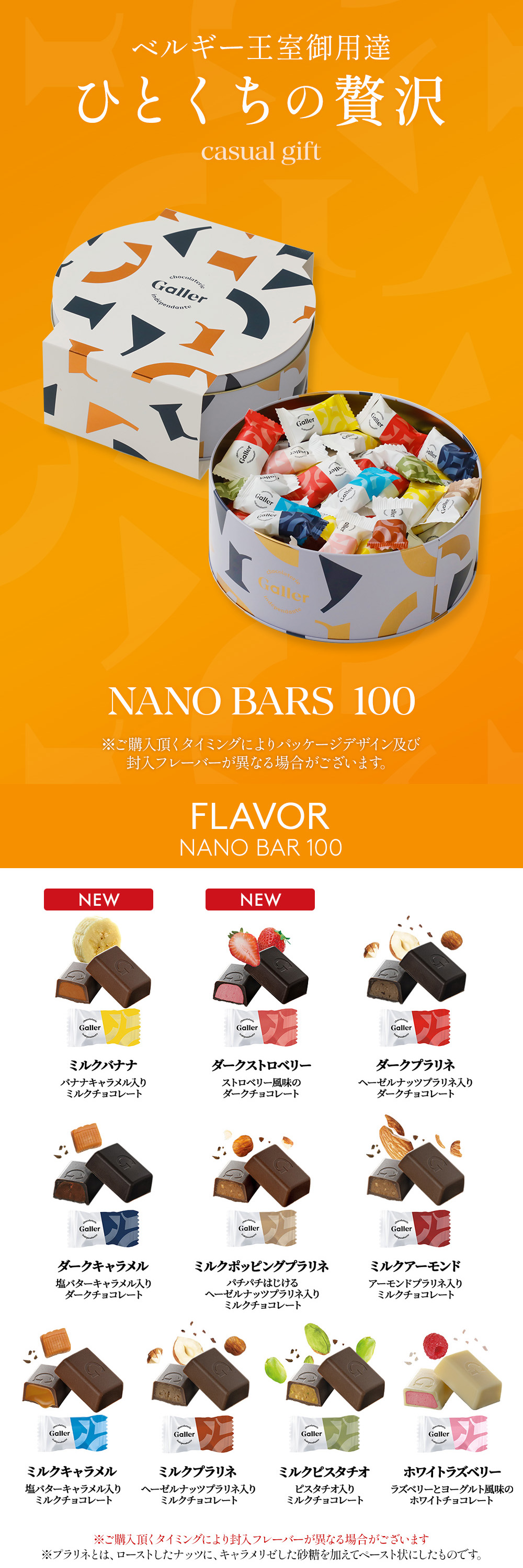 | 【フレーバー/各10個入】 NEW!!【ミルク・バナナ】 バナナキャラメル入りミルクチョコレート NEW!!【ダーク・ストロベリー】 ストロベリー風味のダークチョコレート 【ダーク・プラリネ】 ヘーゼルナッツプラリネ入りダークチョコレート 【ダーク・キャラメル】 塩バターキャラメル入りダークチョコレート 【ミルク・ポッピングプラリネ】 パチパチはじけるヘーゼルナッツプラリネ入りミルクチョコレート 【ミルク・アーモンド】 アーモンドプラリネ入りミルクチョコレート 【ミルク・キャラメル】 塩バターキャラメル入りミルクチョコレート 【ミルク・プラリネ】 ヘーゼルナッツプラリネ入りミルクチョコレート 【ミルク・ピスタチオ】 ピスタチオ入りミルクチョコレート 【ホワイト・ラズベリー】 ラズベリーとヨーグルト風味のホワイトチョコレート |
