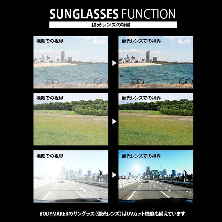 ランニング用のサングラスを選ぶ際に「偏光」と「UVカット」の機能は非常に重要です。本商品のレンズには、「偏光」と「UVカット」の機能を持たせています。