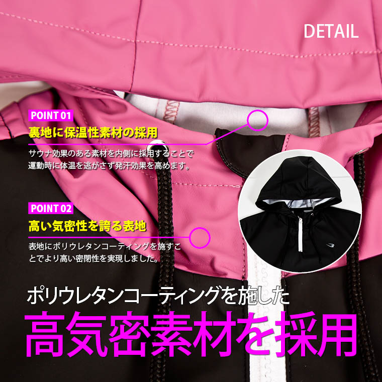 ジャケット左右ポケット付き(ファスナー有)・裾紐通し(ストッパー付き)・フード口紐通し付き 。着用して運動することで、高い保温により効果的な発汗を促します。 ポリウレタンコーティングを施した気密性の高い素材を使用し、運動により上昇した体温を外へ逃がさないことで温度が上昇し、発汗効果を促すことが出来ます。 アスリートの減量や女性のダイエットにも…幅広く利用されています。
