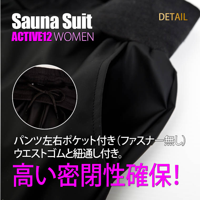 パンツ左右ポケット付き(ファスナー無し)ウエストゴムと紐通しがあり、着用して運動することで、高い保温により効果的な発汗を促します。