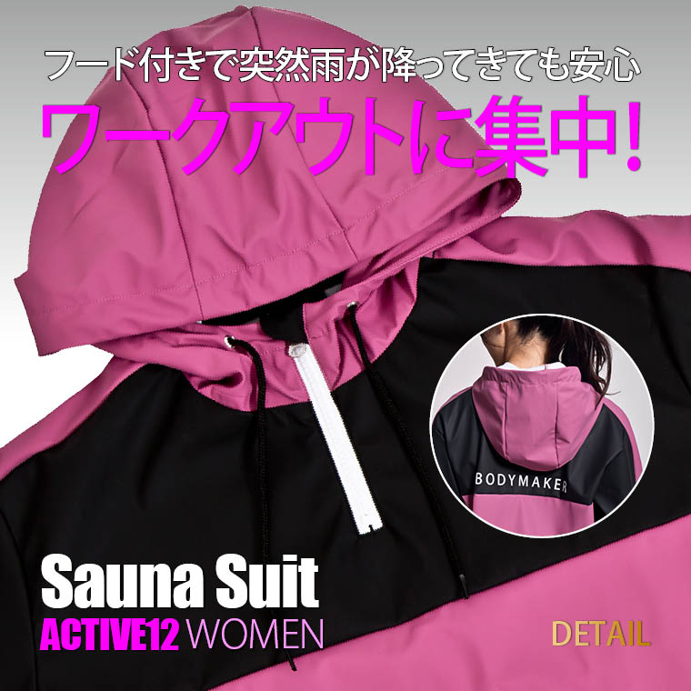 サウナスーツの機能性とデザイン性を兼ね備えたアクティブWOMENラインに新しいデザインが登場。着用して運動することで、高い保温により効果的な発汗を促します。 ポリウレタンコーティングを施した気密性の高い素材を使用し、運動により上昇した体温を外へ逃がさないことで温度が上昇し、発汗効果を促すことが出来ます。従来のサウナスーツ生地からソフトで伸縮性のある生地にバージョンアップしました。首元のファスナーや裾の調節紐など着やすさにこだわったプルオーバー、フード付きで突然雨が降ってきても安心です。アスリートの減量や女性のダイエットに人気のセットアップです。生地には「抗菌・防臭機能」を施し、汗による臭いの原因となる菌の繁殖を抑止。衛生面での不安を取り除きました。プルオーバーのBODYMAKERロゴはリフレクタープリントを採用しています。パンツ背面の裾には反射プリント(リフレクター)を採用。夜間・着用者の安全をサポートします。 ■プルオーバー左右ポケット付き(ファスナー有)・裾紐通し(ストッパー付き)・フード口紐通し ■パンツ左右ポケット付き(ファスナー無し)ウエストゴムと紐通し ※お手入れについて: 品質保持のため、お洗濯は裏返して弱い手洗いをお願いします。(洗濯機不可)乾かす時は日陰の通気性が良い場所に吊るしてください。 開封時に特有のにおいがありますが一定時間の経過とともに消失します。予めご了承ください。