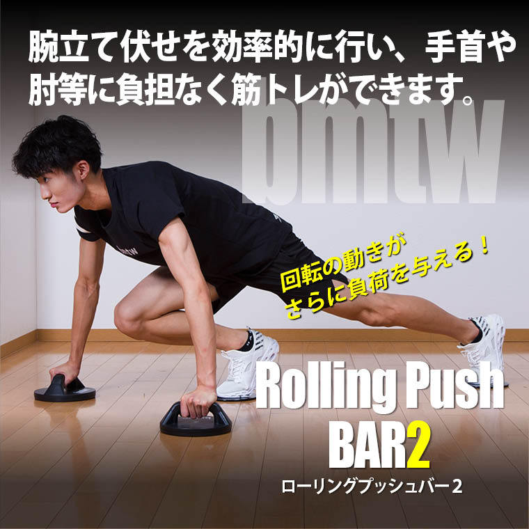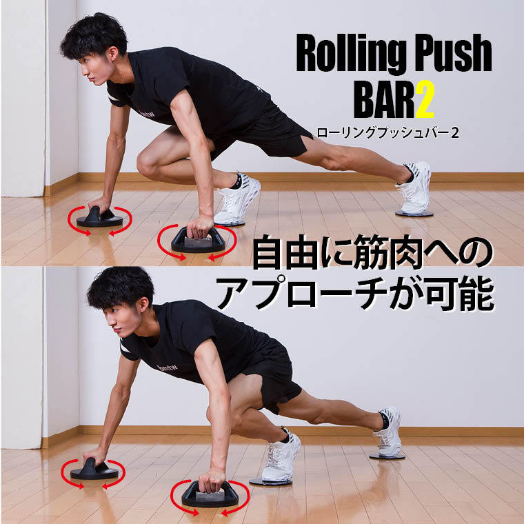 グリップ部分が回転式になっているプッシュバーです。運動中は常に姿勢を安定させることが要求されるので、通常プッシュアップで鍛えられる腕や胸の筋肉だけでなく、さまざまな部分の筋肉が刺激されます。
