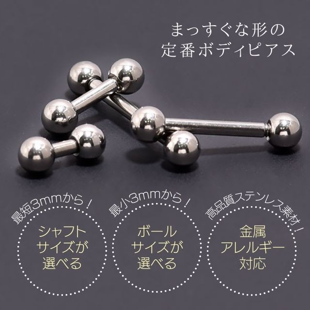 | 特徴 | 定番のストレートバーベルはステンレス素材でファーストピアスにもオススメです。金属アレルギー反応が起きにくい高品質サージカルステンレス素材を使用でつけっぱなしOK。シンプルなデザインなので、コーデにも合わせやすくロブや軟骨ピアス、舌ピアス等色んな部位に使えます。長さも専門店ならではのレアサイズもあるので今までブカブカしていた方もレアサイズなら引っかかりにくく安心してご利用頂けます。両側キャッチが外れるので、同じネジ式のキャッチやチャームでカスタム可能。自分だけのオリジナルのボディピアスが作れます。シンプルなのでいろんな部位に着けれます。イヤーロブ・ヘリックス・アンチトラガス・アウターコンク・インナーコンク・ラブレット(口ピアス)・リップ(口ピアス)・マドンナ・チーク・センタータン・タンリム・タンエッジ |