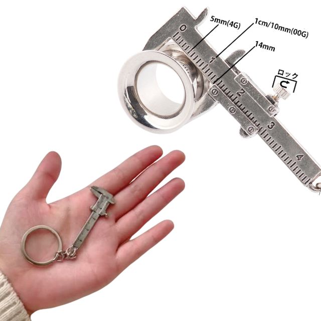 | 素材 | ロジウム | | サイズ | 全長サイズ約11cm | | 特徴 | コレは、便利!久しぶりにピアスを着けたい、でもサイズは?このシャフトの長さってどのくらいあるんだろう?をこのミニチュアのキーホルダーが解決。小さいので計れるサイズに限界はありますがそこそこ計れます。※あくまでもキーホルダーなのですごく正確ではありませんがおおよそのサイズは測れます。※入荷時期によりメモリの色が黒いもの白いものがあります、予めご了承ください。1個は持っておくのもオススメです。 | | 注意 | 写真はできる限り現品を再現するよう心がけておりますが、お客様のモニター環境により商品のイメージと異なる場合がございます。ご了承ください。※1個売りです。 | |