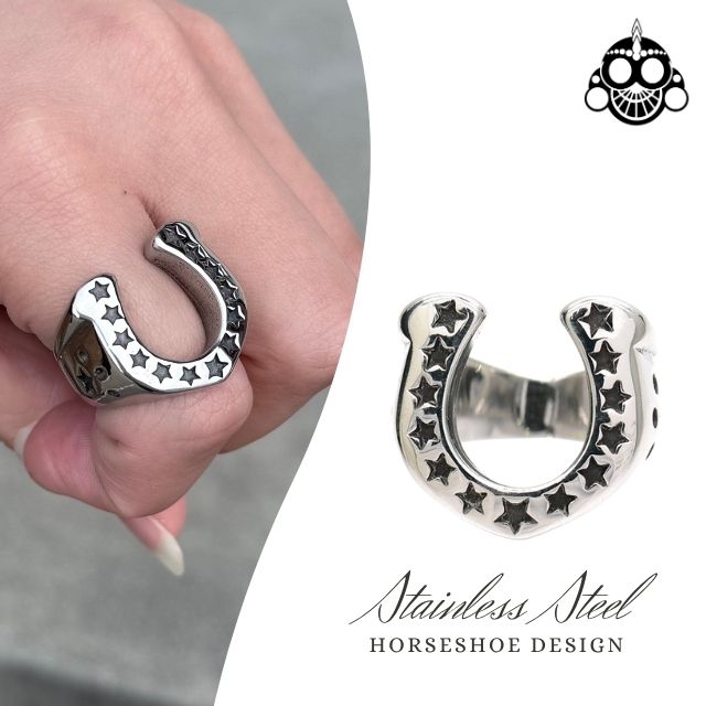 | 素材 | ステンレススティール | | サイズ | デザインサイズ約21mm×24mm(指輪の号数で多少異なる) 指輪後ろの幅約6mm サイズ展開14号〜22号 | | 特徴 | ラッキーアイテムとして人気の「ホースシュー(馬蹄)」モチーフに、スターエングレービング(星型彫刻)を施したステンレスリングです。シルバー調の落ち着いた輝きとユニークなフォルムで、指元に個性をプラス。メンズ・レディース問わずユニセックスでご使用いただけます。耐久性に優れたステンレス素材を使用しているため、変色や錆びに強く、長くご使用いただけます。カジュアルからロック系まで幅広くマッチ!指にしっかり映える大ぶりデザインがオススメです。 | | 注意 | 写真はできる限り現品を再現するよう心がけておりますが、お客様のモニター環境により商品のイメージと異なる場合がございます。ご了承ください。※1個売りです。 |