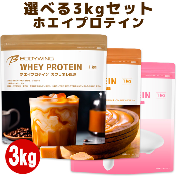 ボディウイング ホエイプロテイン ヨーグルト・キャラメル・カフェオレ 各1kgで合計3kgのお得なセットになります。