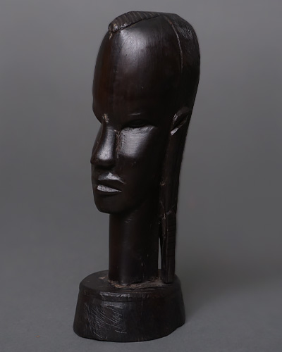 マコンデ彫刻特有の精悍な顔立ちや独特の髪型が、深い漆黒の光沢の中に力強く表現されており、見る角度によって異なる表情を見せるのが魅力です。