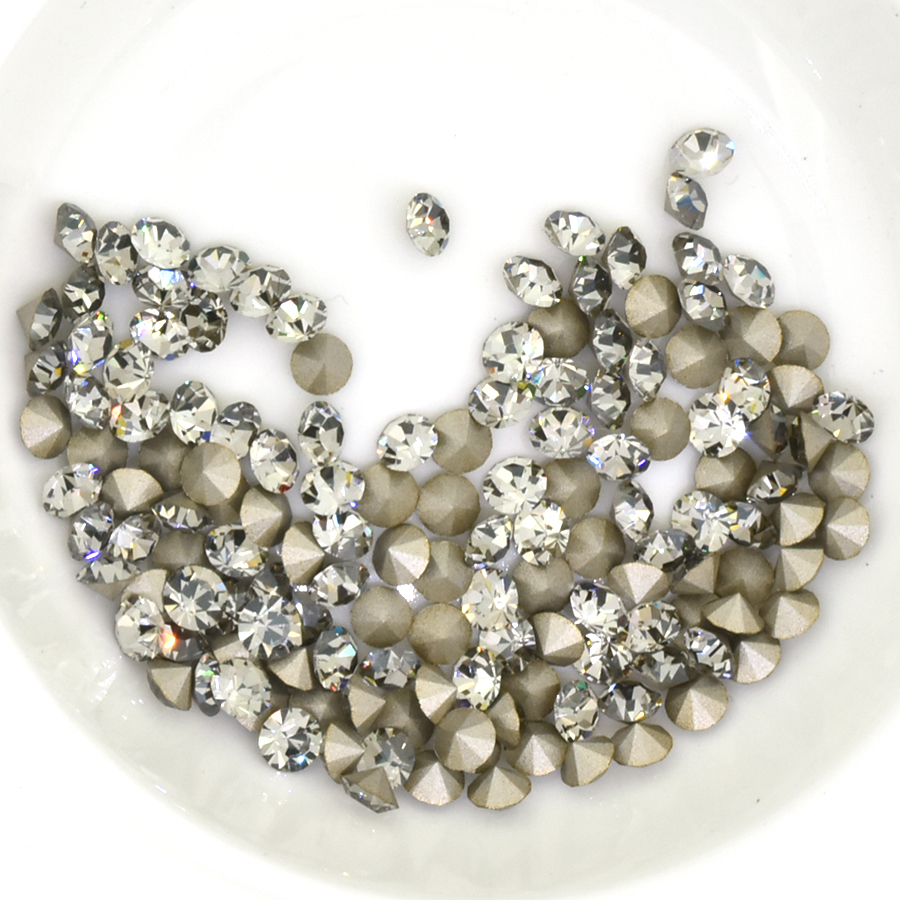 チェコ プレシオサ社のクリスタルチャトンです。ラウンド Vカットとなります。透明ガラスのアイテムには裏面にフォイルが施されており、ジェットやターコイズなど不透明系のカラーはフォイルがついていません。
