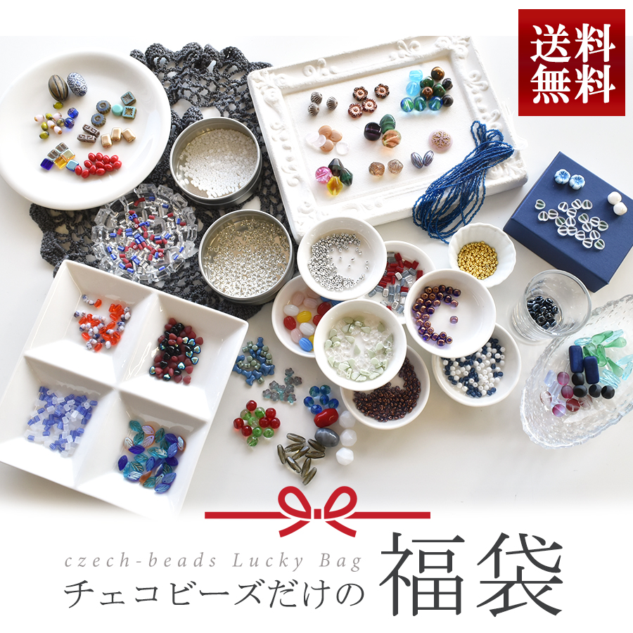 チェコビーズだけのお得な福袋です。1万2千円相当のビーズが入って3,300円。送料無料でお届けします。さらに、ヨーロッパヴィンテージビーズを2個おまけ。
