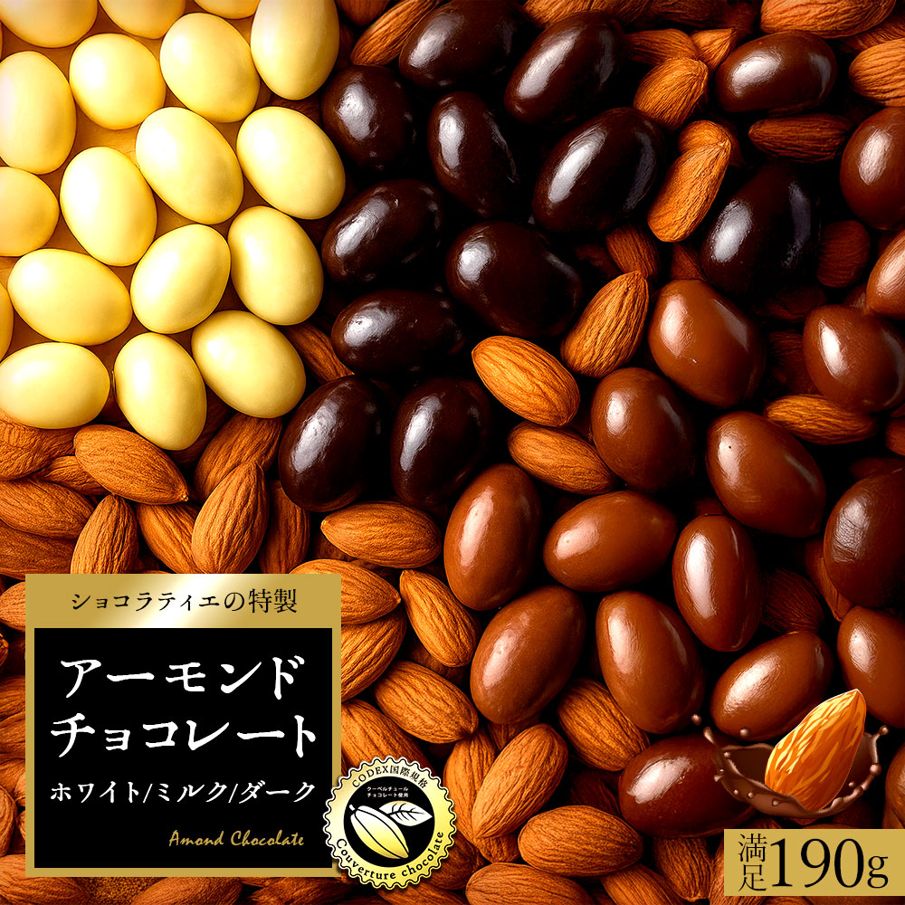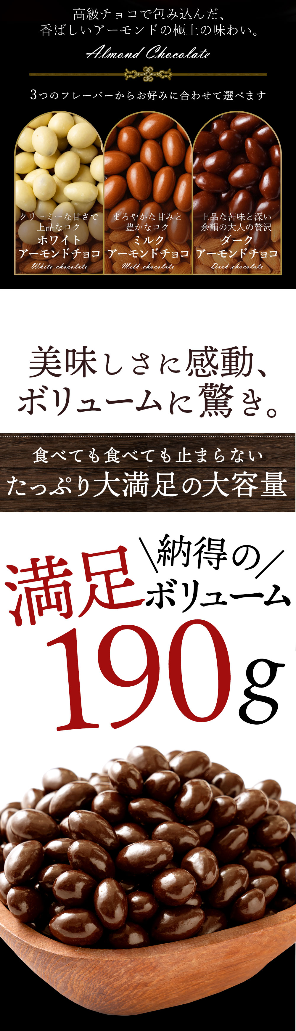 ■ダークアーモンドチョコレート:アーモンド(アメリカ)、砂糖、カカオマス、ココアバター、水飴/光沢剤、乳化剤、香料、(一部にアーモンド・乳成分・大豆を含む)