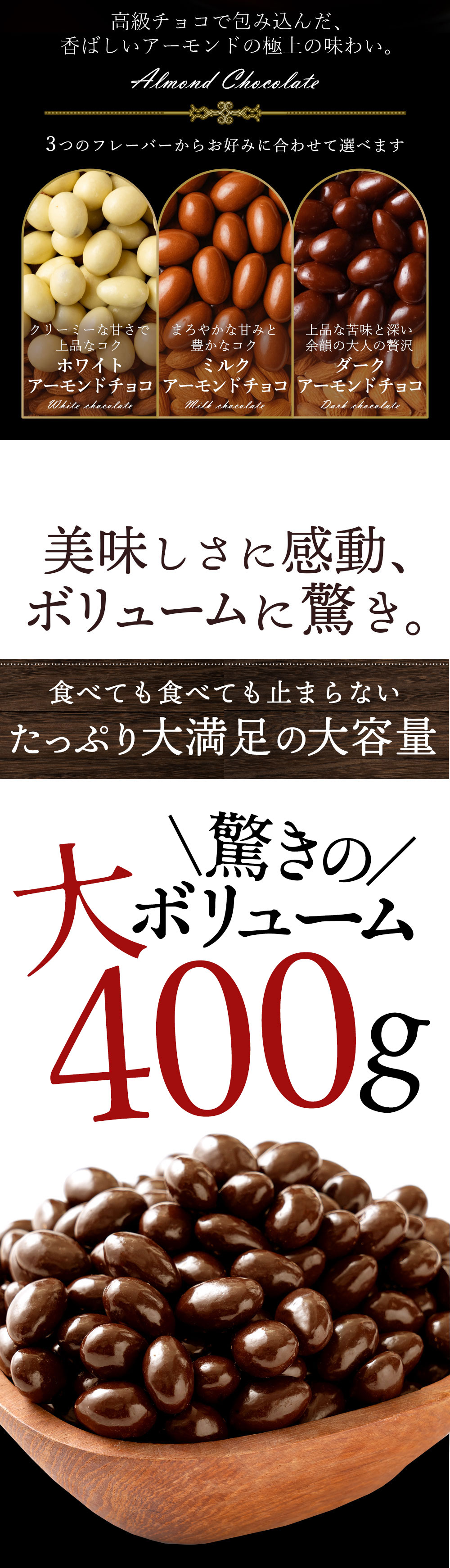 ■ダークアーモンドチョコレート:アーモンド(アメリカ)、砂糖、カカオマス、ココアバター、水飴/光沢剤、乳化剤、香料、(一部にアーモンド・乳成分・大豆を含む)