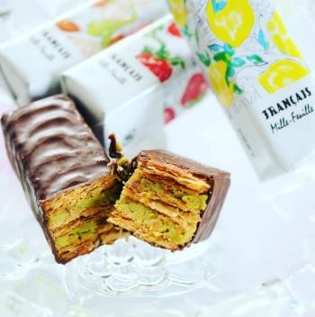 ★濃厚で奥深い味わいのピスタチオクリームをパイでサンドし、スイートチョコレートで包みました。ピスタチオの贅沢な香りとコクが口いっぱいに広がります。