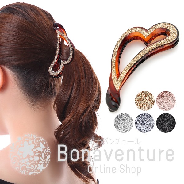 可愛らしさの中にも凛とした雰囲気を感じさせるハートラインのバナナクリップ。ポニーテールにほどよくフィットする幅広のクリップが実用的です。後ろ姿にも印象的な存在感で、男子モテにも女子モテにも自信が持てます!