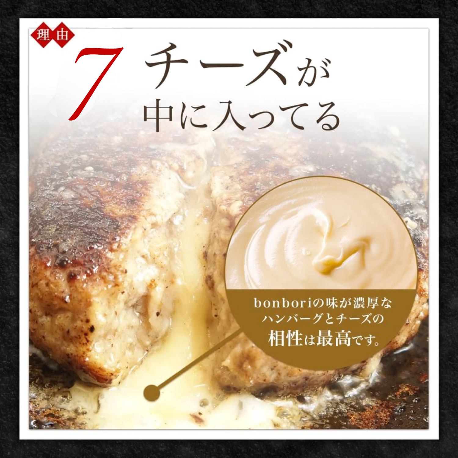 濃厚なハンバーグと相性ばっちりなチーズがたっぷりと入っています。ハンバーグを焼くと、とろけたチーズがハンバーグに絡み、最高の贅沢を味わう事が出来ます。