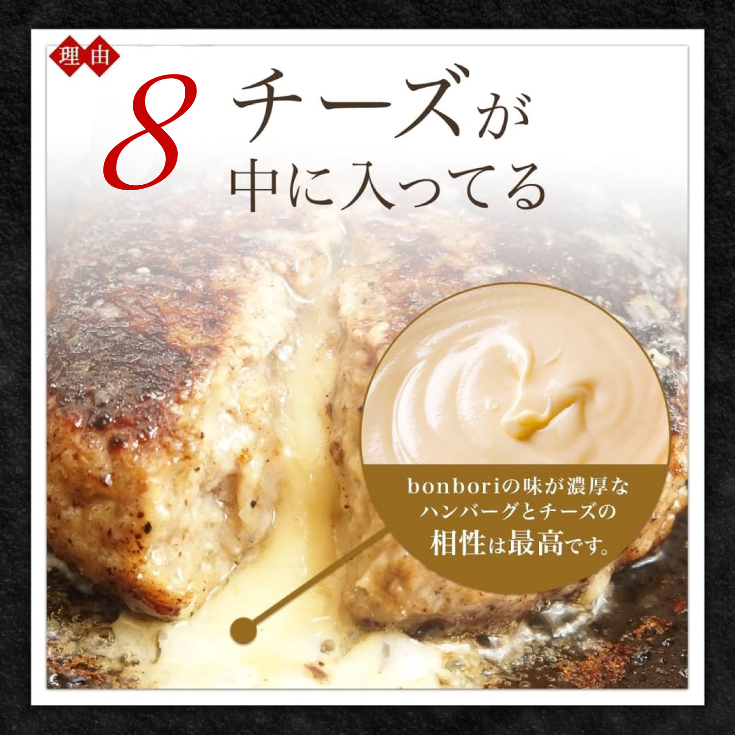 濃厚なハンバーグと相性ばっちりなチーズがたっぷりと入っています。ハンバーグを焼くと、とろけたチーズがハンバーグに絡み、最高の贅沢を味わう事が出来ます。