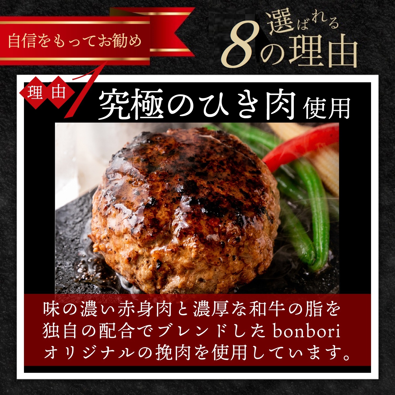 赤身と脂身 の 配合 にこだわった 究極の挽肉 で 作った ハンバーグ は 肉の味 が 濃厚 なので ソース付き ですが まずは ソース無し で ハンバーグの美味しさ を 感じて頂ければと思います