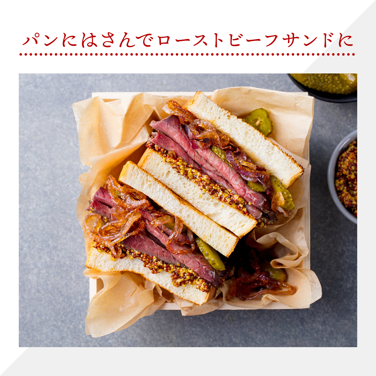 ソースとレホールが付いているので、解凍して切るだけで、御馳走が完成します。様々なアレンジも可能で、ご飯に乗せてローストビーフ丼、パンに挟んでローストビーフサンド、スライスしてソースをかけて簡単オードブル、等々色々楽しむ事が出来るローストビーフです♪