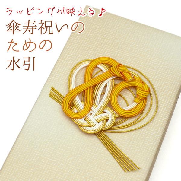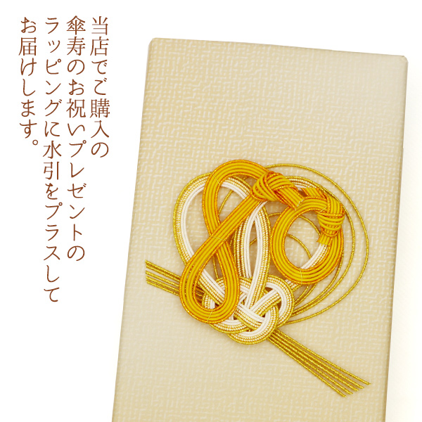 当店で傘寿のお祝いのプレゼントを同時にご購入の際は、出荷時にラッピングに水引を貼り付けてお届けいたします。