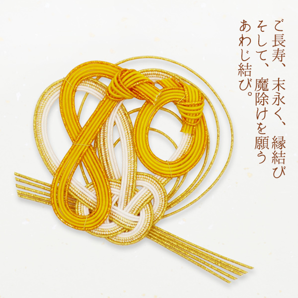 あわじ結びを取り入れたこの水引のデザインには、お祝いされる方への、ご長寿が末永く続きますように、という意味が込められています。