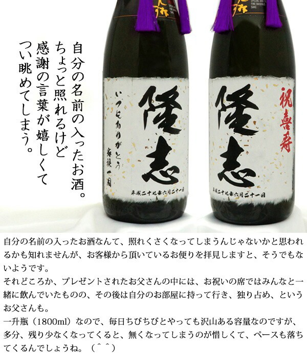 一升瓶のお酒はちょっと飲みすぎなお父さんには多すぎると思ってしまうかも知れませんが、そんな意味も込めて プレゼントされてはいかがでしょうか。