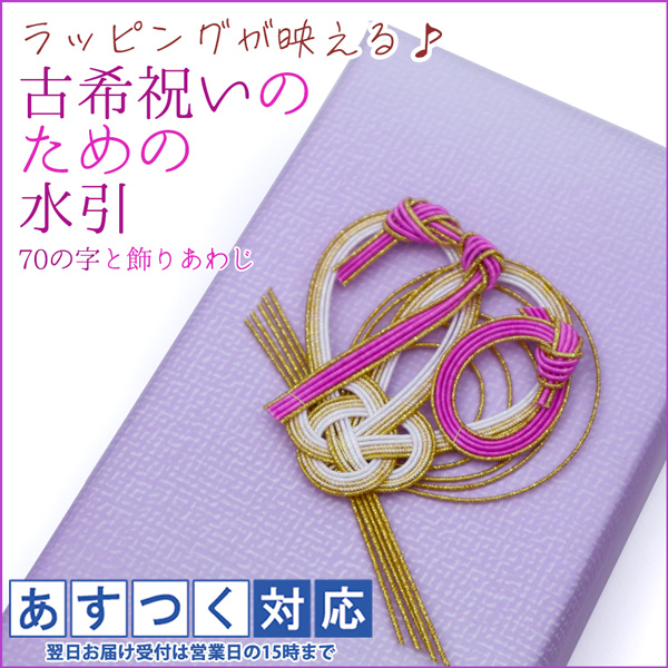 当店でご購入の古希のお祝いのプレゼントのラッピングに、水引をプラスしてお届けできます。
