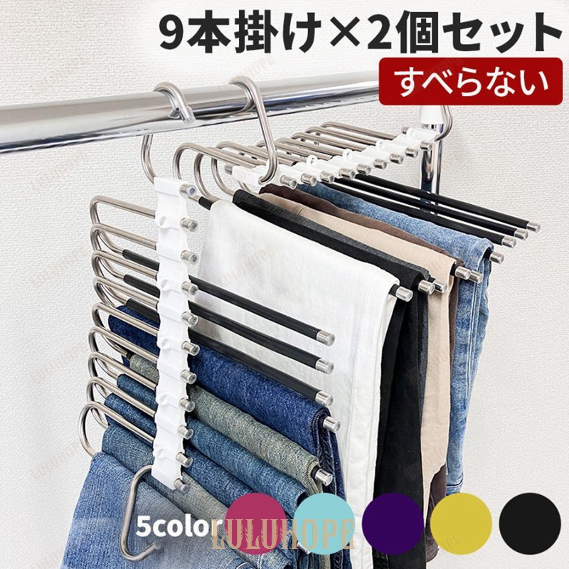 ズボンハンガー 9連 2個セット スラックスハンガー ステンレス スリム 大容量 すべらない 跡がつかない 収納 ズボン デニム クローゼット 衣類収納 縦 横 2WAY