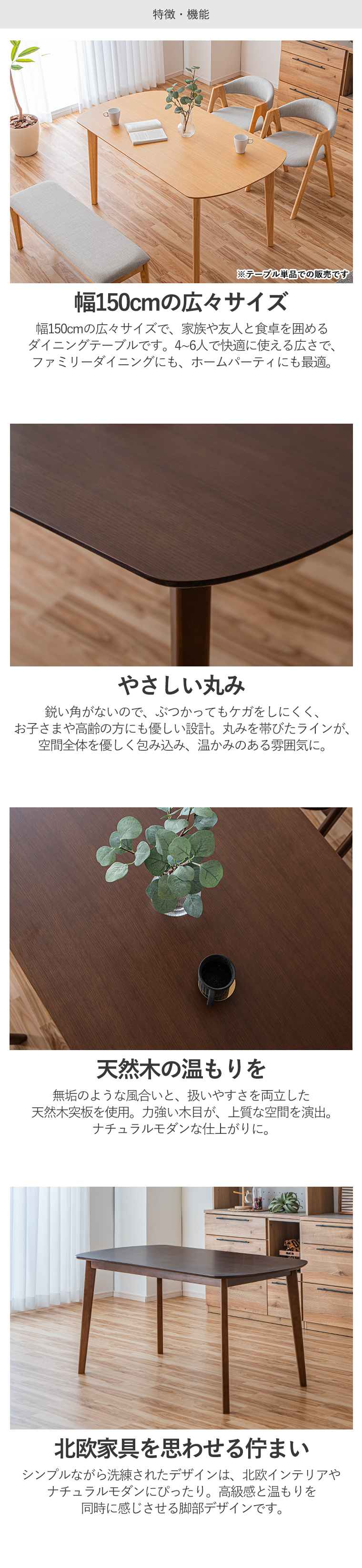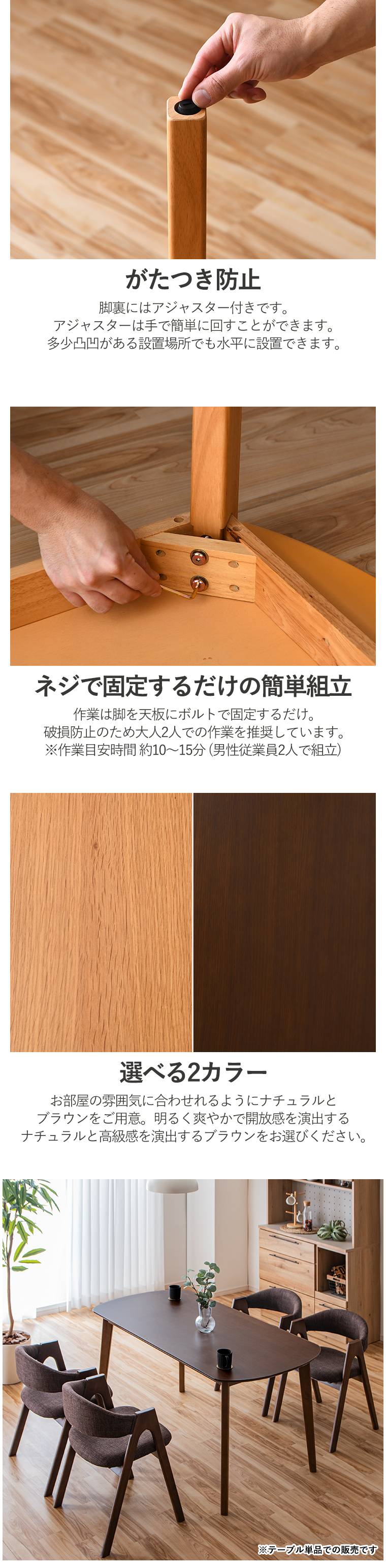 | ・テーブル単品販売になります ・テーブルは角に丸みをもたせており、お部屋の雰囲気を柔らかな印象をもたせてくれます ・みんなが集う癒しの空間に ・テーブルの天板にはそれぞれオーク、ウォールナットの突板を使用しており木の温もりをより一層感じることができます ・脚はボルトで止めるだけの簡単取り付けです ・テーブルは使い込むほどに色合いの変化があり、長く使う楽しみができる木材です ・安価なシート張りと比べ高級感があり、強度も抜群です | |