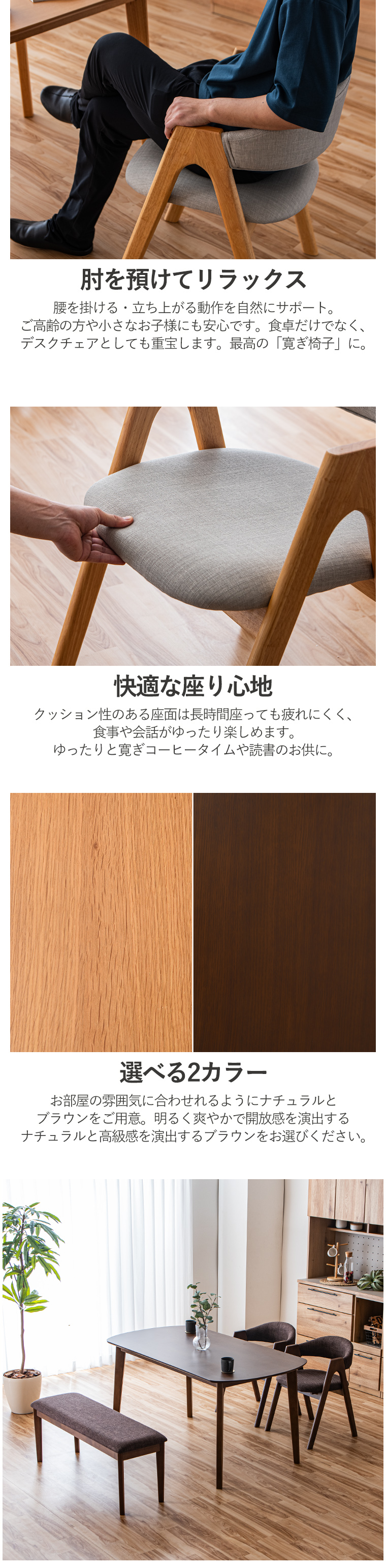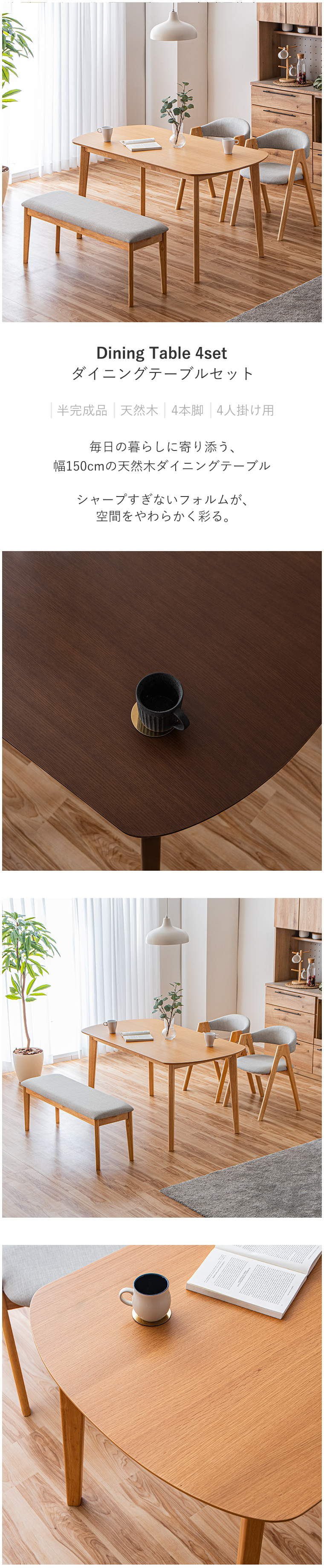| ・ダイニング4点セット ・丸みのあるテーブルと個性的なダイニングチェア ・テーブルは角に丸みをもたせており、お部屋の雰囲気を柔らかな印象をもたせてくれます ・チェアとベンチの座面にはファブリックを使用しており年中さらりとした肌さわりです ・みんなが集う癒しの空間に ・テーブルの天板にはそれぞれオーク、ウォールナットの突板を使用しており木の温もりをより一層感じることができます ・脚はボルトで止めるだけの簡単取り付けです ・チェアの背もたれはやさしい背あたりで長時間座っていても楽な姿勢を保てます ・テーブルは使い込むほどに色合いの変化があり、長く使う楽しみができる木材です ・安価なシート張りと比べ高級感があり、強度も抜群です | |