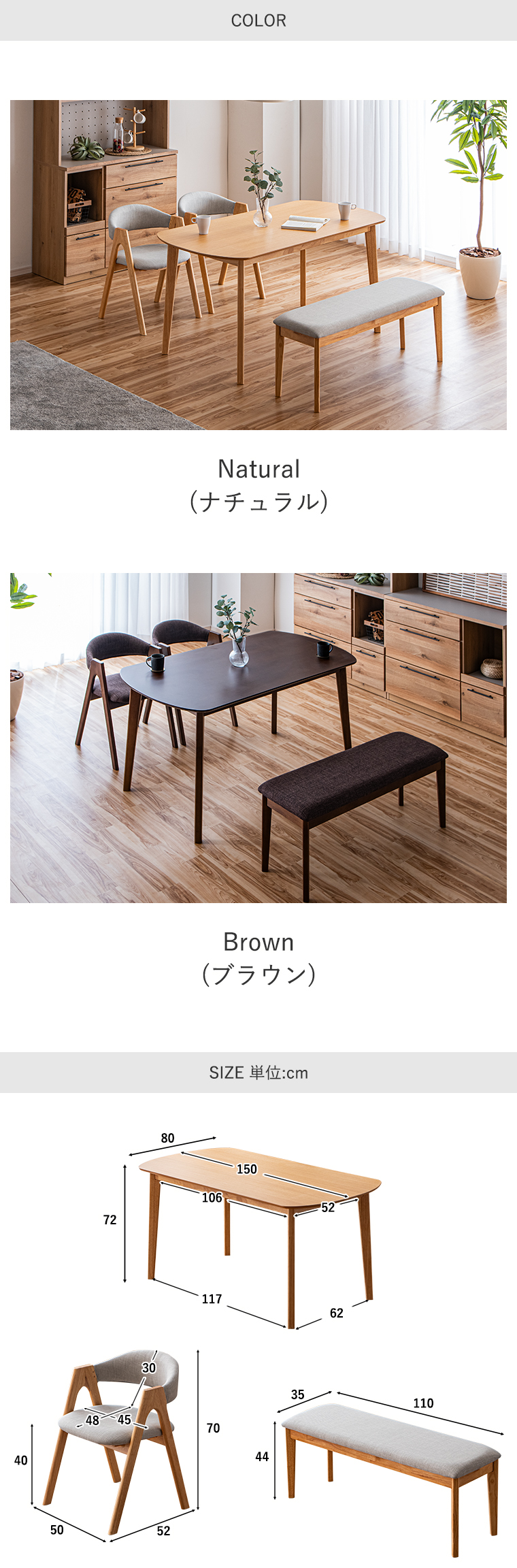 | サイズ | テーブル:幅150×奥行80×高72cm チェア:幅50×奥行52×高70cm(SH40) ベンチ:幅110×奥行35×44cm |