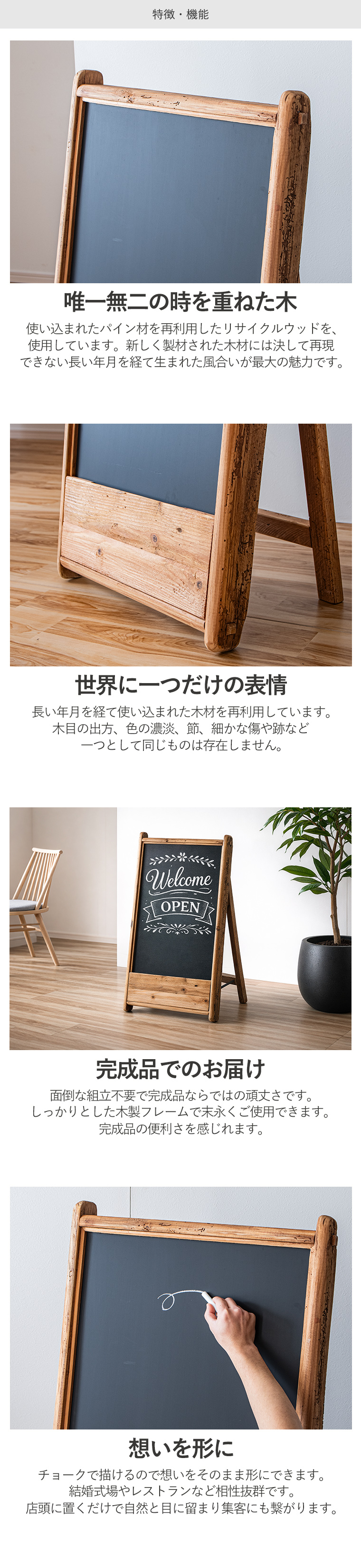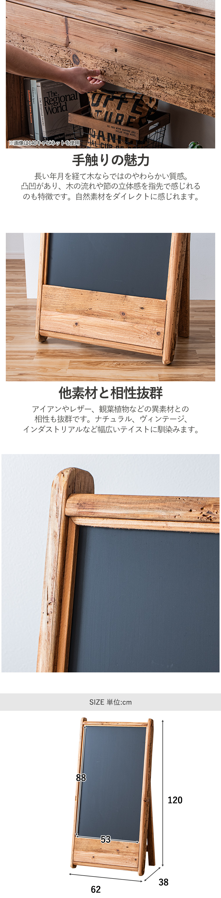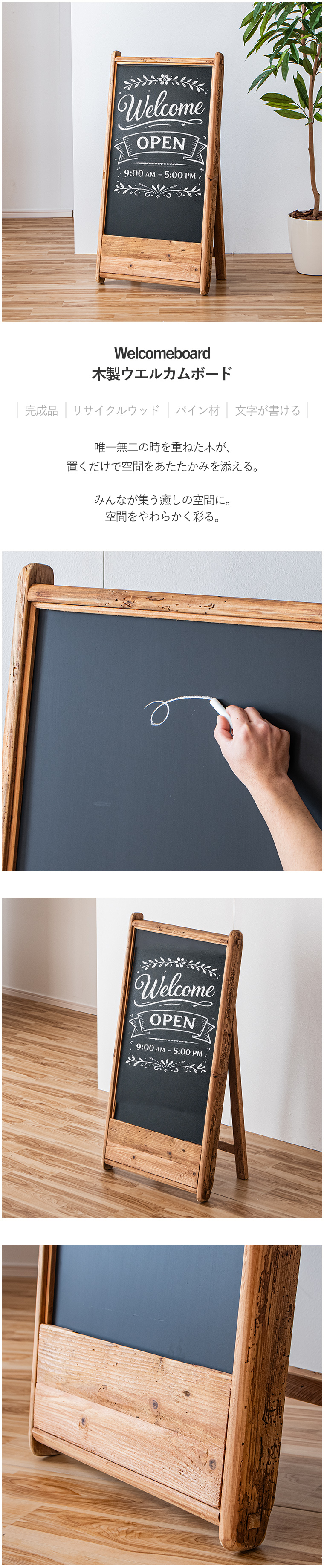 | ※リサイクル材を使用の為、釘を抜いた跡や虫食い跡がございます ※使用にあたって問題はございません ※木の節や傷み具合には個体差あり。不良ではございませんので返品交換はできません ・折りたたみ式ブラックボード ・唯一無二の時を重ねた木 ・使い込まれたパイン材を再利用したリサイクルウッドを使用 ・新品には決して再現できない長い年月を経て生まれた風合いが最大の魅力です ・世界に一つだけの表情 ・木目の出方、色の濃淡、節、細かな傷や跡など一つとして同じものは存在しません。 ・生活動線を邪魔せず使いやすい。 ・置くだけで空間を仕切る ・壁を作らなくても家具を置くだけで自然な仕切りに。 ・ボルトを回すだけの簡単作業 ・しっかりとした木製フレームで末永くご使用できます。 ・個性ある一点モノ ・リサイクルウッドを使用しているので同じ表情はなく使い込まれた木だけが持つ自然な風合いが、空間にあたたかみとストーリーを添えてくれます。 ・経年変化を楽しめる ・使うほど色味が深まりより味わいのある表情へと変化していきます。 ・時間とともに育つ風合いもお楽しみ頂けます。 ・古材を再利用した環境に配慮した素材を使用。 ・限りのある資源を大切にしながら味わいある家具に生まれ変わりました。 ・長い年月を経て木ならではのやわらかい質感。 ・凸凹があり、木の流れや節の立体感を指先で感じれるのも特徴です。 ・自然素材をダイレクトに感じれます。 | |