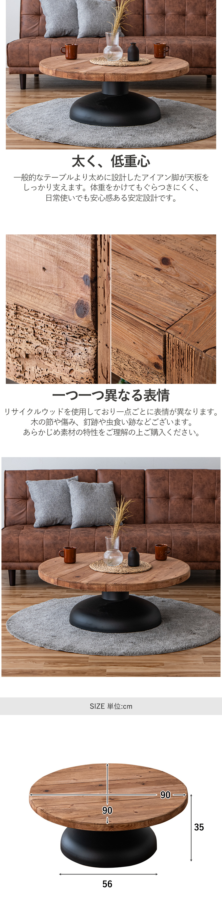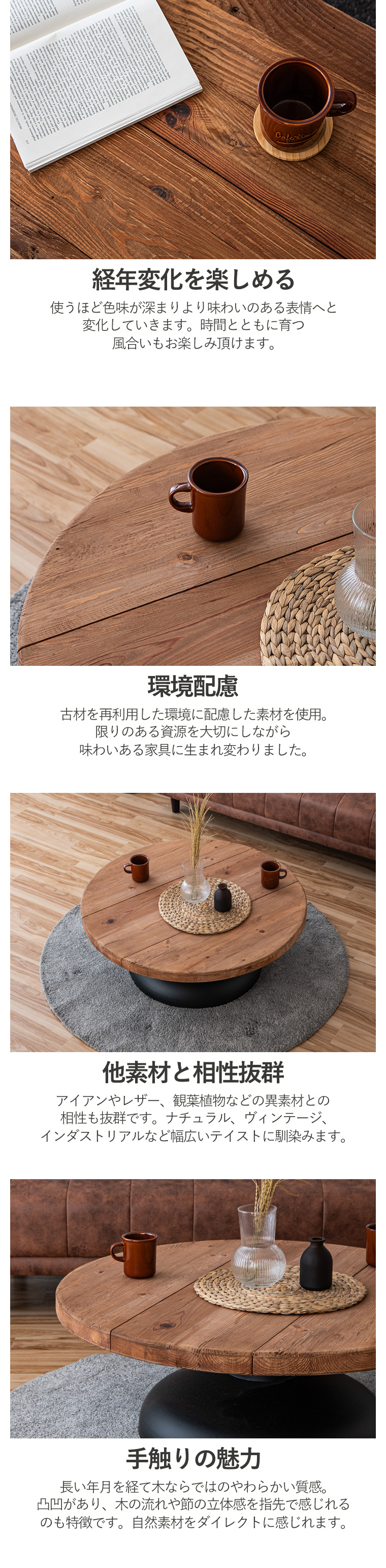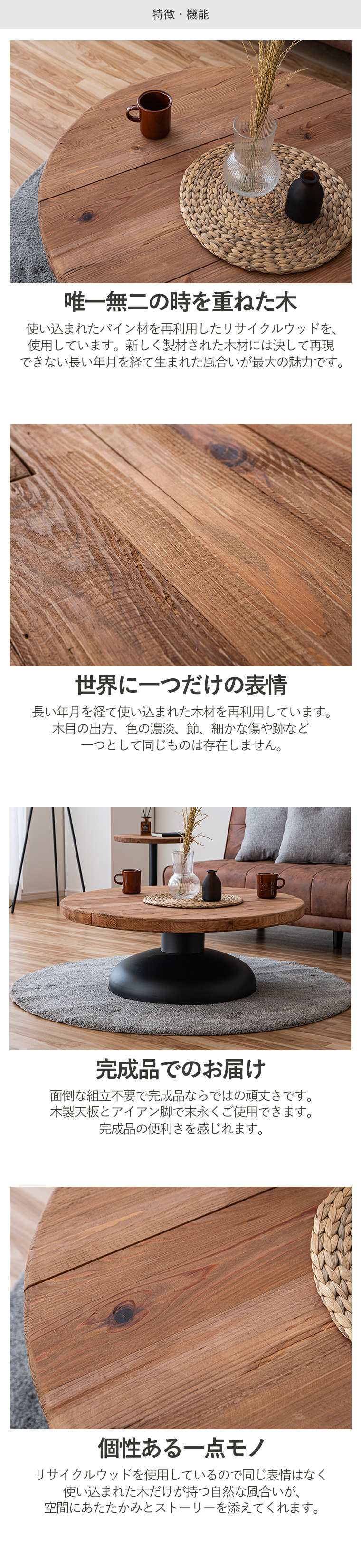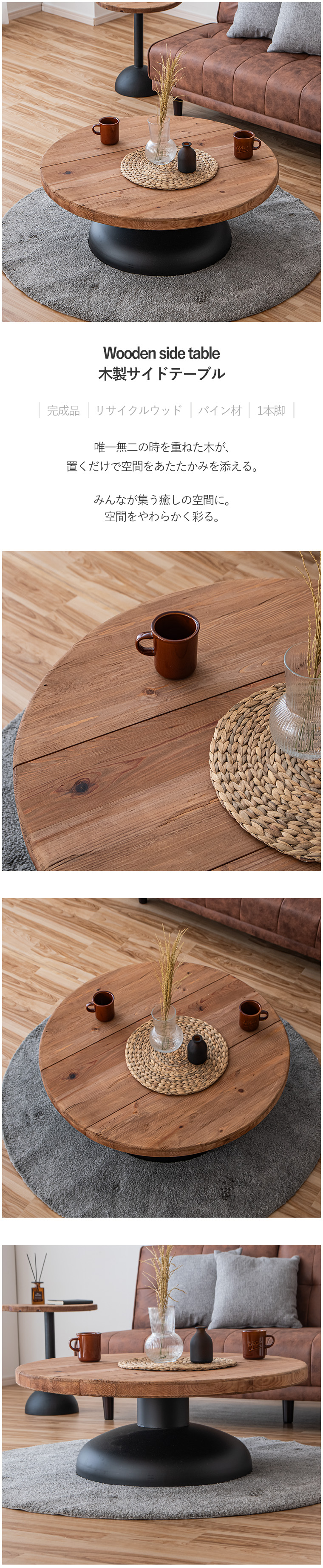 | ※リサイクル材を使用の為、釘を抜いた跡や虫食い跡がございます ※使用にあたって問題はございません ※木の節や傷み具合には個体差あり。不良ではございませんので返品交換はできません ・唯一無二の時を重ねた木 ・使い込まれたパイン材を再利用したリサイクルウッドを使用 ・新品には決して再現できない長い年月を経て生まれた風合いが最大の魅力です ・世界に一つだけの表情 ・木目の出方、色の濃淡、節、細かな傷や跡など一つとして同じものは存在しません。 ・お気に入りをレイアウト ・広々とした天板はただの置き場ではなく、”好き”をレイアウトできるディスプレイスペース。 ・日々の暮しに彩りを添えるアイテムを飾れます。 ・生活動線を邪魔せず使いやすい。 ・個性ある一点モノ ・リサイクルウッドを使用しているので同じ表情はなく使い込まれた木だけが持つ自然な風合いが、空間にあたたかみとストーリーを添えてくれます。 ・経年変化を楽しめる ・使うほど色味が深まりより味わいのある表情へと変化していきます。 ・時間とともに育つ風合いもお楽しみ頂けます。 ・古材を再利用した環境に配慮した素材を使用。 ・限りのある資源を大切にしながら味わいある家具に生まれ変わりました。 ・長い年月を経て木ならではのやわらかい質感。 ・凸凹があり、木の流れや節の立体感を指先で感じれるのも特徴です。 ・自然素材をダイレクトに感じれます。 | |