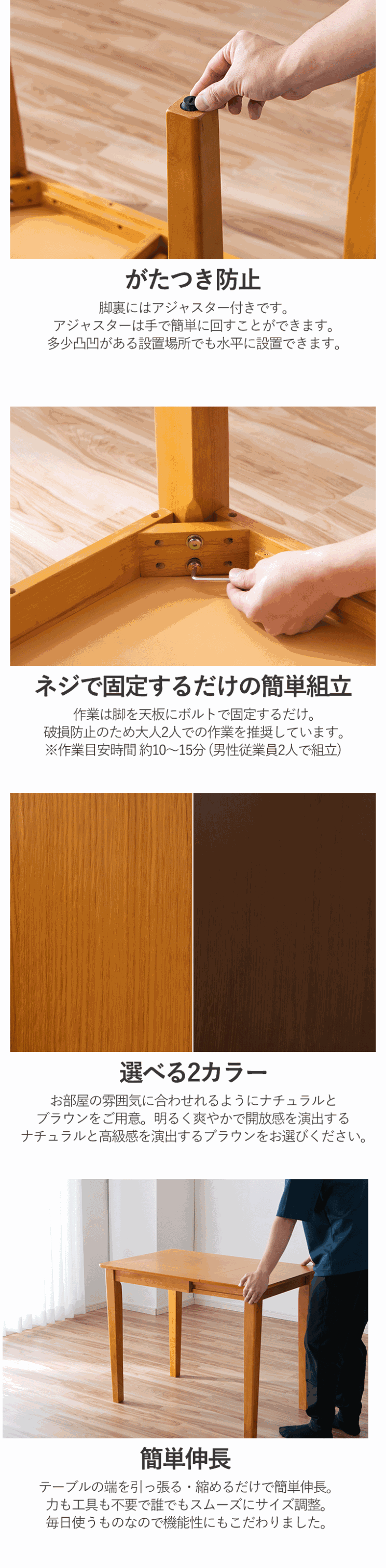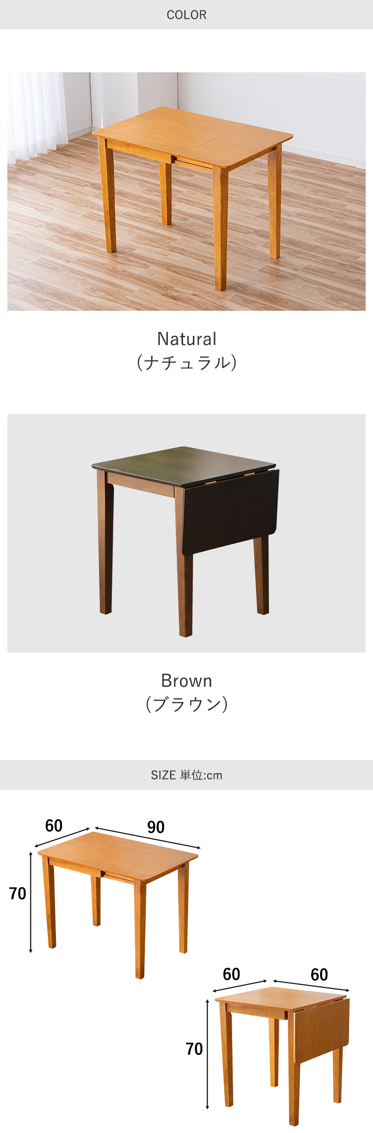 | ・シンプル×スマートなダイニングテーブル単品 ・折りたたみテーブル ・リビングを彩るダイニングテーブル ・家族とのティータイムや食事や友人の来客など暮らしの中で使用されるダイニングテーブル ・毎日の食卓を楽しくおいしく感じさせてくれるダイニングテーブルです ・力要らずで簡単折りたたみ ・通常時は幅60cmとコンパクトで置きやすいサイズ ・来客時など広く使いたいときは広げて幅90cmに ・脚裏にはアジャスターが付いているのでガタつきません ・天板には天然木を使用 ・ナチュラルにはオーク突板、ブラウンにはウォールナット突板を使用しています ・肌触りがよく木のあたたかみを感じることができます | |