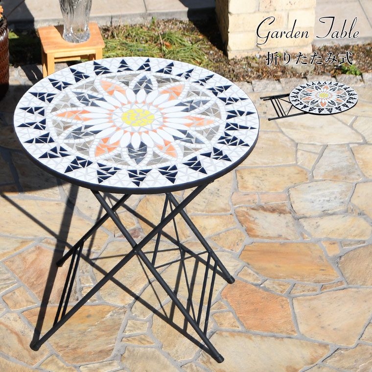 ガーデンテーブル 雨ざらし タイルテーブル 折りたたみ 屋外 丸テーブル モザイク フラワー アウトドア 70