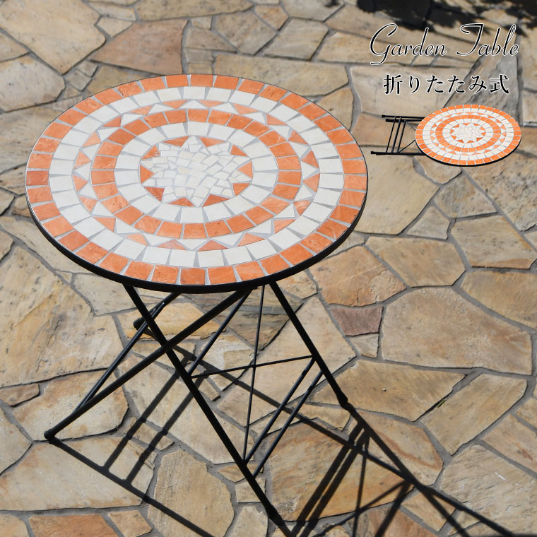 ガーデンテーブル 雨ざらし タイルテーブル 折りたたみ 屋外 丸テーブル モザイク 星型 アウトドア 70