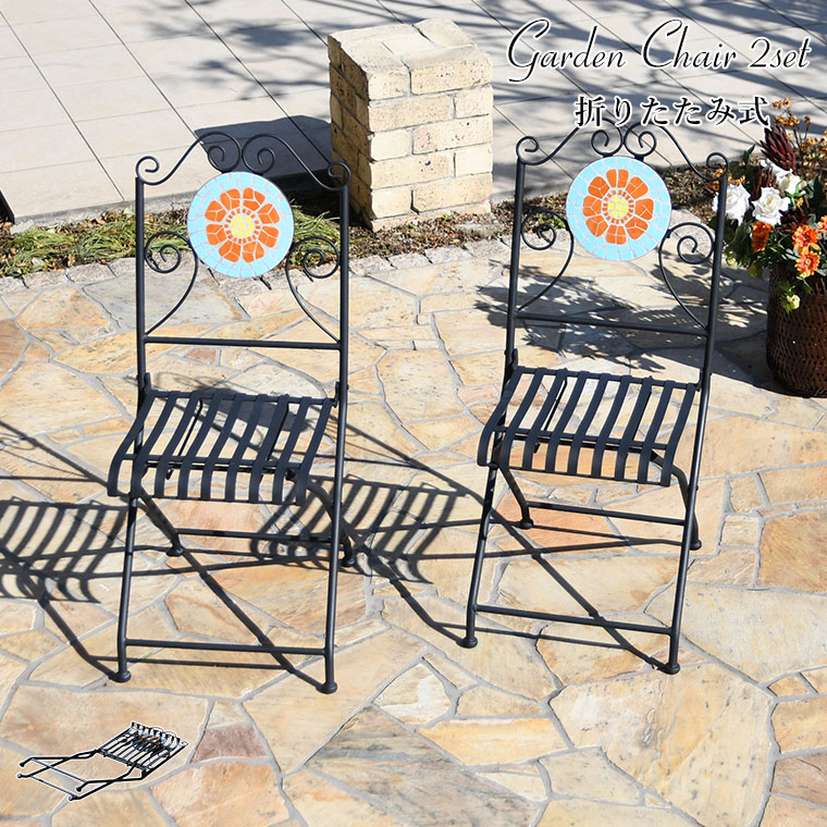 ガーデンチェアセット 2脚セット 雨ざらし タイル 屋外 モザイク 花柄 フラワー アウトドア 40 安い アイアン