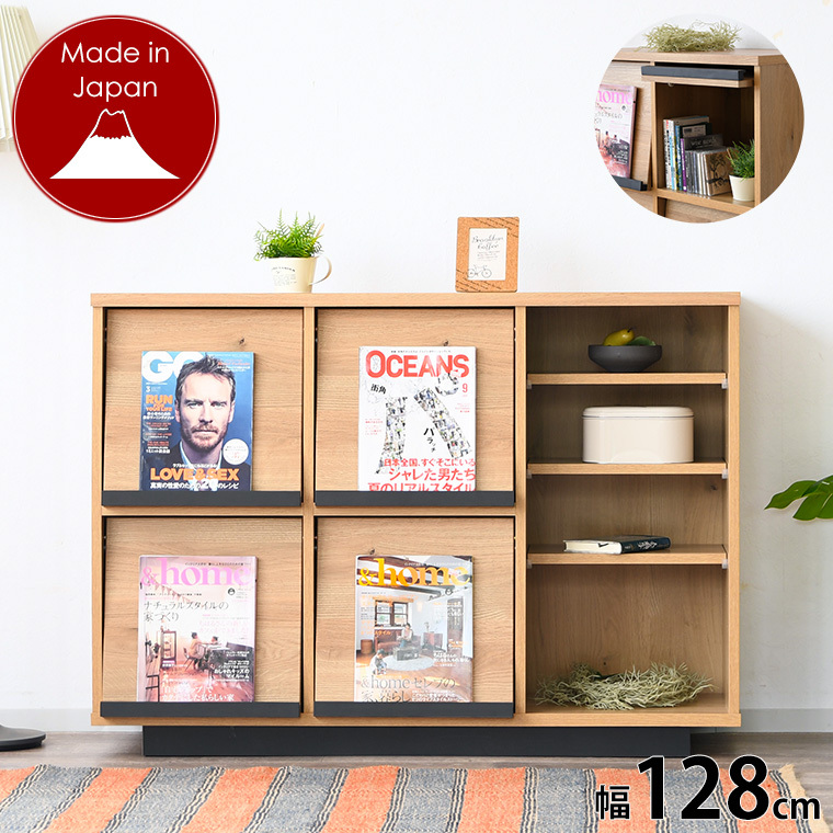 | ・家具の産地で有名な福岡県大川市で一本一本丁寧に仕上げています ・安心安全の日本製です ・材料にもこだわりを ・本体には木目の美しい強化紙を使用 ・一見天然木と見間違えるほどの完成度で天然木のような質感を楽しめます ・魅せる、隠せるフラップボード ・お気に入りの書籍など飾る事ででき、扉を開ければ物を隠すこともできます ・ローラーがついているので力が要らず女性の方でも楽々開閉できます ・オープン部は可動棚が3枚ついています ・高さの調節ができ多目的に使用できます ・可動棚の耐荷重は5kgです | |