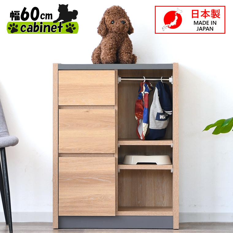| ・幅60cmキャビネット ・多くなりがちなペットの洋服やおもちゃなどこれ一台でスッキリ片付きます ・美しく使いやすいキャビネット ・機能性にもこだわり収納上手なキャビネットです ・家具の産地で有名な福岡県大川市で製造しています ・こだわりのポイント紹介 ・ハンガーポール付きで洋服などかけれます ・引出しは3段あり収納力抜群 ・棚は可動式で2枚あります ・ハンガーポールを取り外すこともできます ・引出しはスライドレール付きで出し入れ楽々 ・完成品でのお届けになります | |