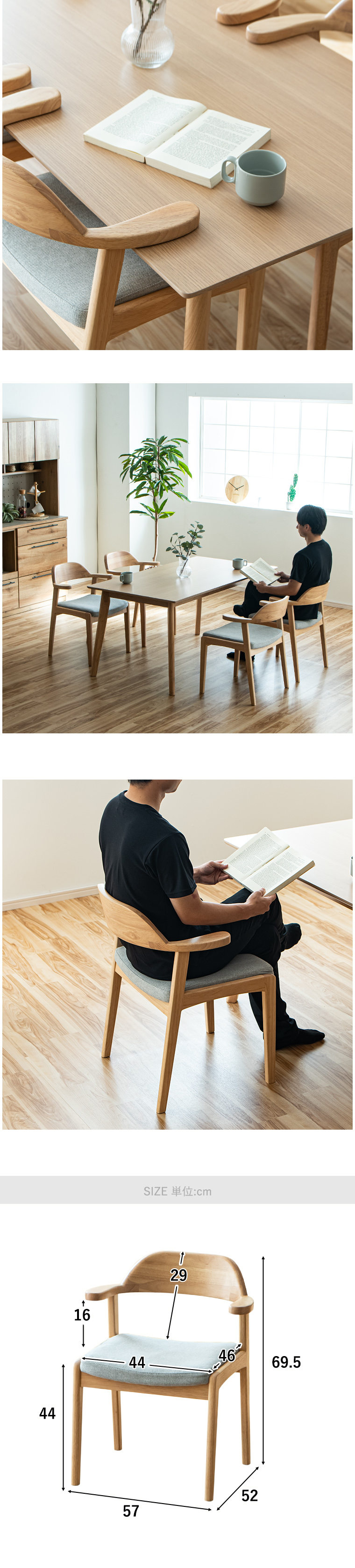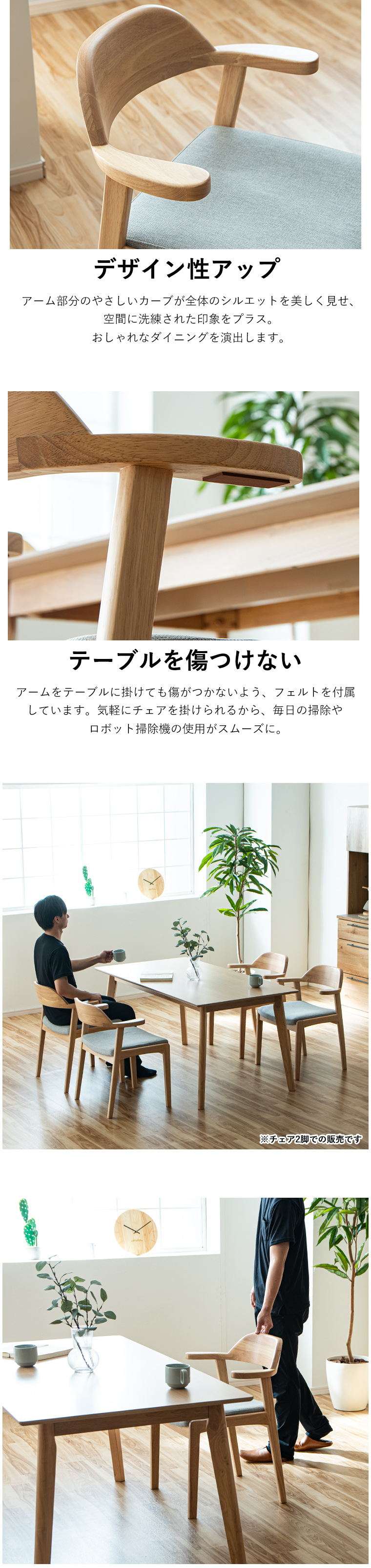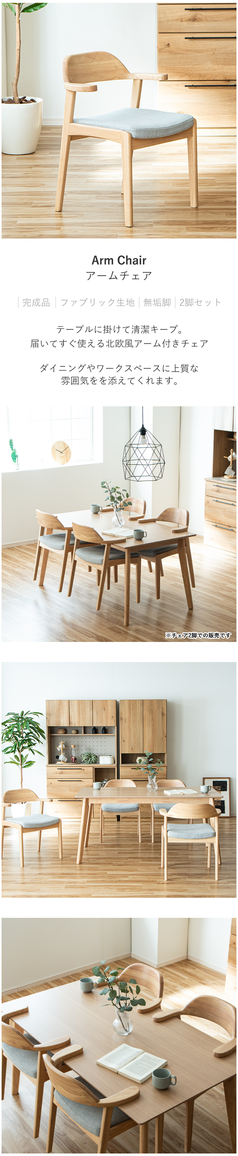 ・チェア2脚セットでの販売です ・笑顔のあるぬくもりの場所に ・木が放つ特有の温かみを持ったチェアで家族や友人との時間をお楽しみください ・フレームにはラバーウッド無垢、座面にはファブリックを使用しています ・木のぬくもりを感じれるハーフアームチェア ・テーブルに掛けれるのでお掃除する際邪魔になりません ・優しく背中を支える ・カーブを描いた背もたれがしっかり背中を支えます |