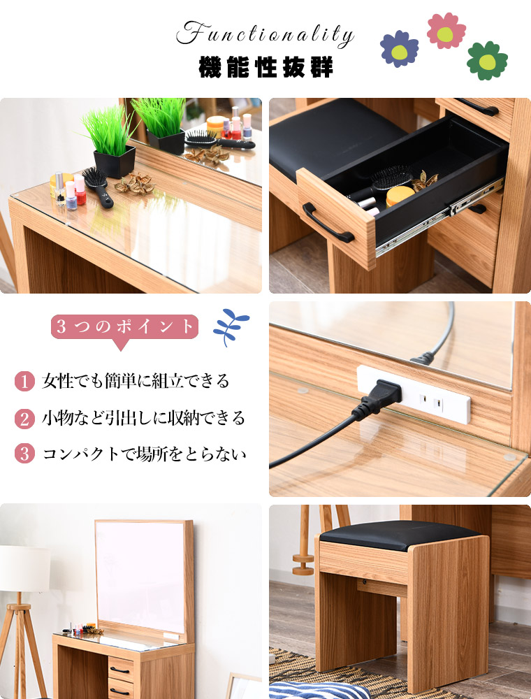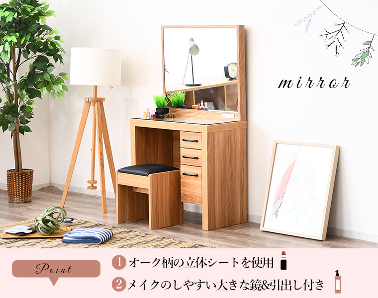 | ・毎日使うものだから、より使いやすく… ・デザイン性も機能性にもこだわった収納ドレッサーです。 ・あったら嬉しいスツール付きです ・天然木のような質感を感じれます ・材質は立体感のある強化紙を採用 ・オーク柄の立体感のあるシートは天然木のような質感を感じれます ・オシャレで便利、収納力も豊富 ・オーク柄のシート美しく存在感を発揮します ・どんどんと増える化粧品や美容家電などひとまとめできます ・ナチュラルなデザインなのですんなりとお部屋に馴染みます | |