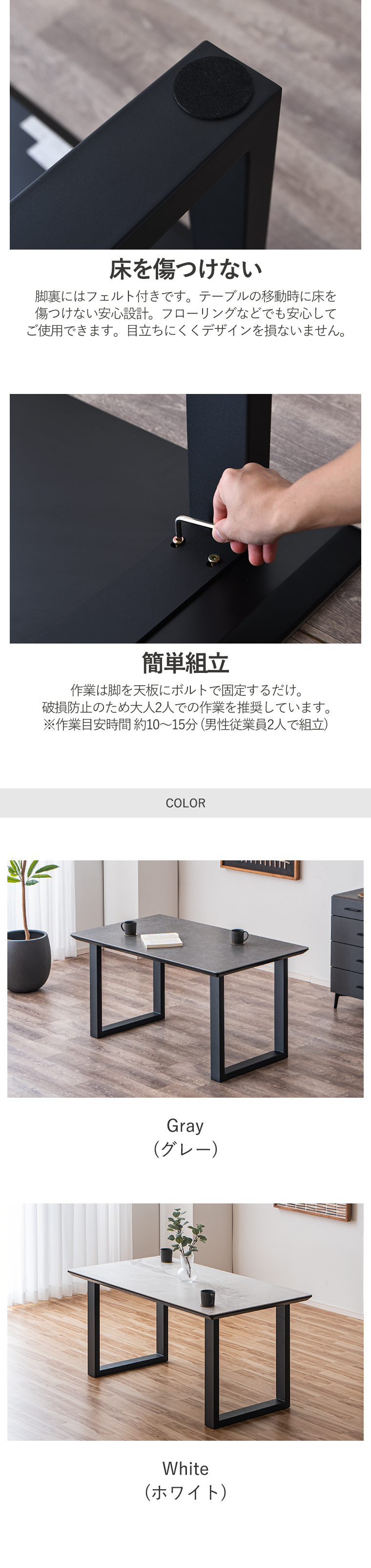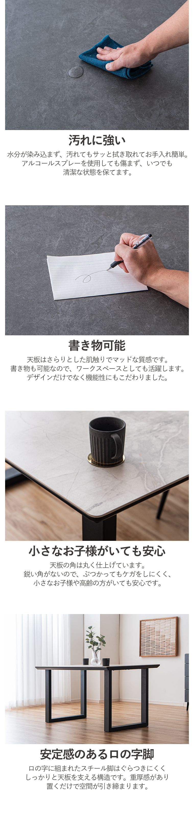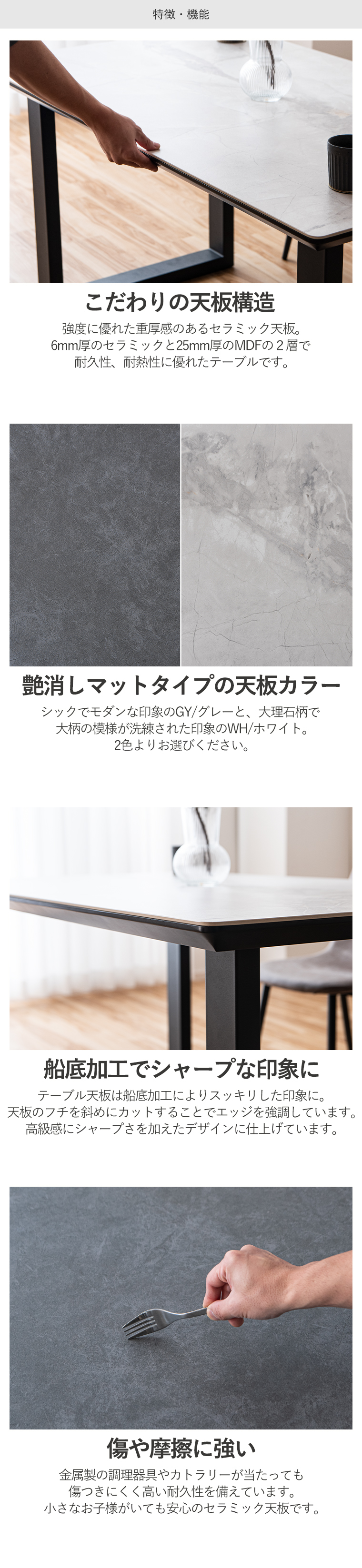 | ・ダイニングテーブル単品商品です ・彩り鮮やかな料理を引き立させるセラミックテーブル ・傷や汚れ、耐久性に優れたセラミックテーブル ・重厚感と存在感のあるダイニングテーブル ・大理石柄と石目調から選べる2カラー ・高級感を演出しお部屋の雰囲気を引き締めてくれます ・天板と脚はボルトでとめるだけの簡単組立です ・脚の裏にはフェルトがついており床を傷つけません ・毎日の食事をおいしく楽しくしてくれるダイニングテーブル ・傷や汚れ等に非常に強く耐久性に優れたテーブルです ・高級感漂うセラミックテーブル ・お子様がいる家庭でも安心してご使用いただけます | |