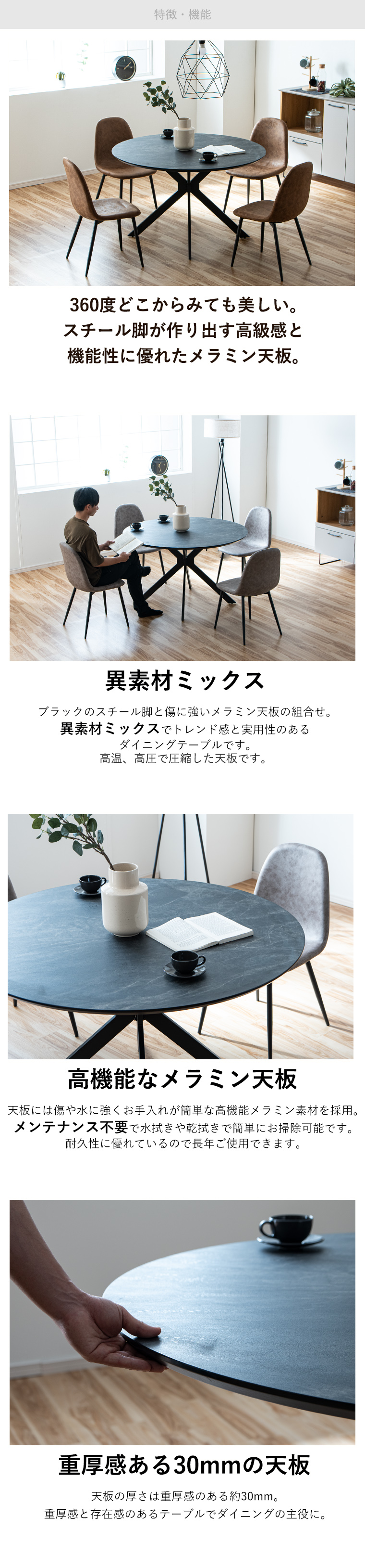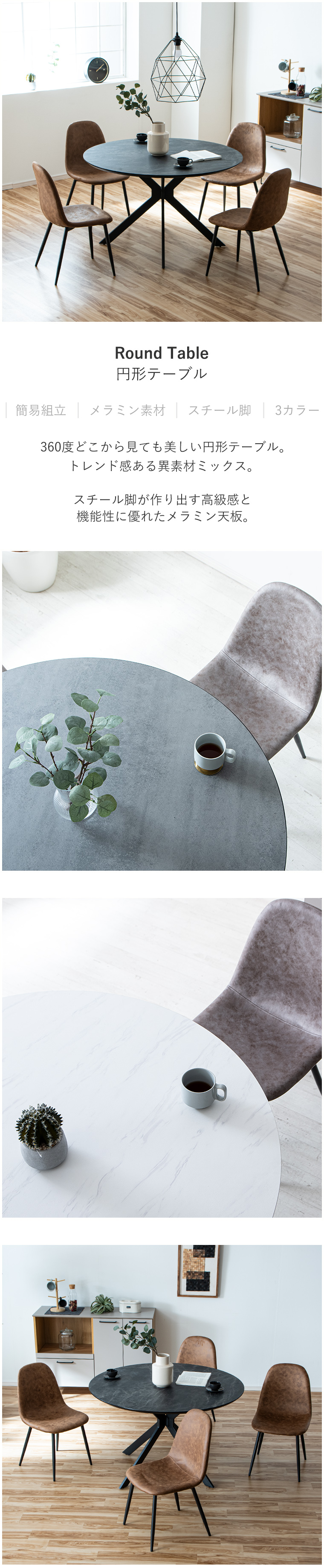 | ・ダイニング5点セット ・幅120cmの円形テーブル ・天板にはメラミンを使用しています ・傷や汚れ等に強く小さなお子様がいても安心です ・角がなく丸みを帯びているので圧迫感がなくお部屋をスッキリ見せてくれます ・ヴィンテージ感あふれるダイニングチェア ・丸みがあり柔らかな曲線がお部屋にすんなりと馴染みます ・経年変化を思わせるようなデザインがヴィンテージの雰囲気を作り出します ・落ち着きのある男前の空間に ・穏やかな時間を過ごすことができカフェのような空間を作り出します ・お部屋になじみやすいデザイン性 ・北欧風にもモダンスタイルにもマッチします ・コーディネートの幅が広がるデザイン | |
