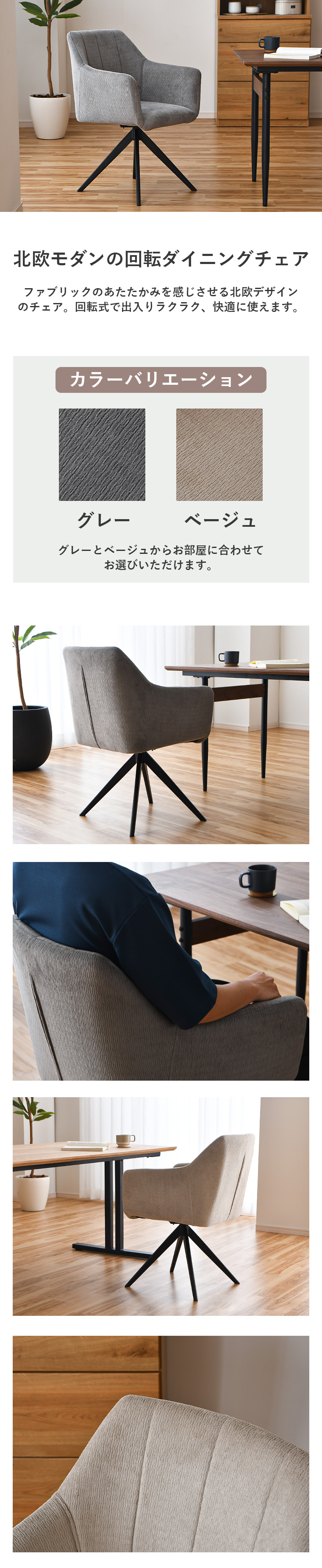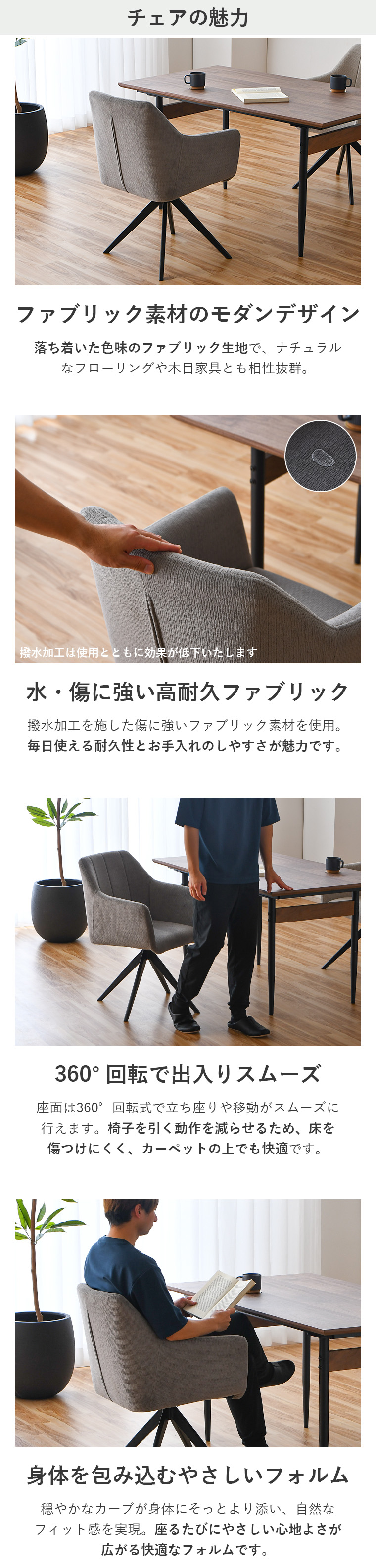 | ・北欧モダンの回転ダイニングチェア ・ファブリックのあたたかみを感じさせる北欧デザインのチェア ・回転式で出入りラクラク、快適に使えます ・落ち着いた色味のファブリック生地で、ナチュラルなフローリングや木目家具とも相性抜群 ・撥水加工を施した傷に強いファブリック素材を使用 ・毎日使える耐久性とお手入れのしやすさが魅力です ・座面は360°回転式で立ち座りや移動がスムーズに行えます ・椅子を引く動作を減らせるため、床を傷つけにくく、カーペットの上でも快適です ・穏やかなカーブが身体にそっとより添い、自然なフィット感を実現 ・座るたびにやさしい心地よさが広がる快適なフォルムです ・スタイリッシュで洗練された印象のアイアン脚 ・落ち着いた雰囲気のあるインテリアにぴったり! ・付属の工具で回転盤と脚を取り付け、座面と回転盤をボルトで固定し完成 ・ダイニングチェア単品商品です | |